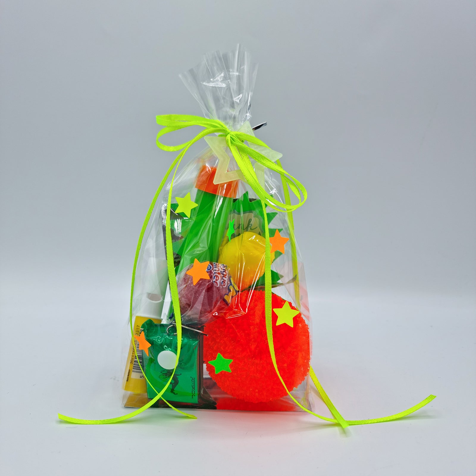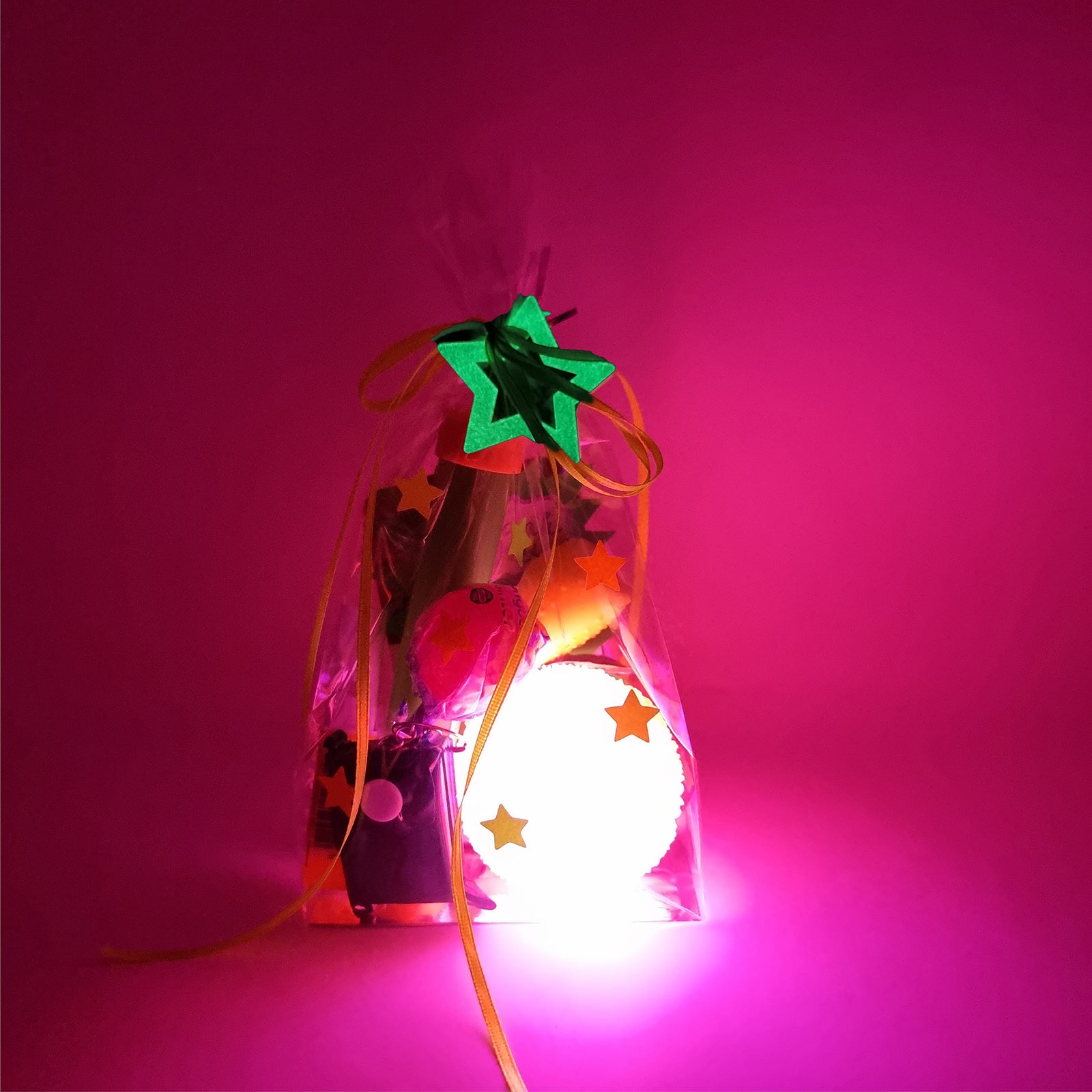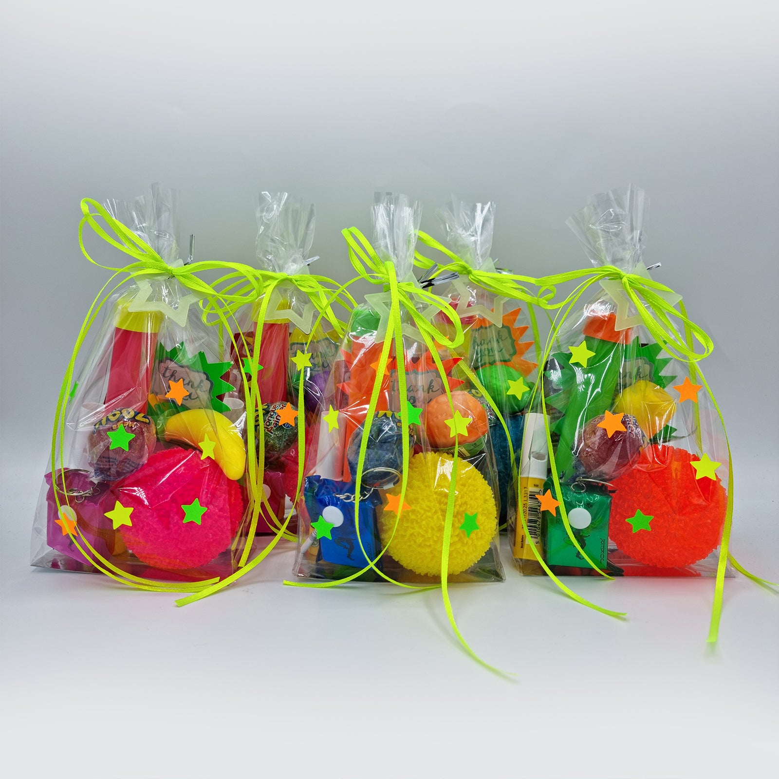 We have prepared our goody bags especially for you, with each one pre-packed in a premium, thick cellophane gift bag adorned with neon stars and secured with a vibrant neon ribbon with attached glow in the dark star. As you open the bag, you'll find a neon 'Thank You' card nestled inside, adding a special touch to your experience.