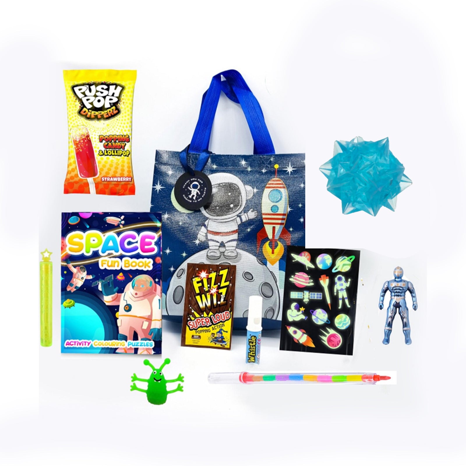 Inside each party bag, you'll discover an array of space themed goodies. Filled with a captivating selection of novelty cosmic toys and delectable vegetarian sweets, which were carefully chosen to spark the imagination.