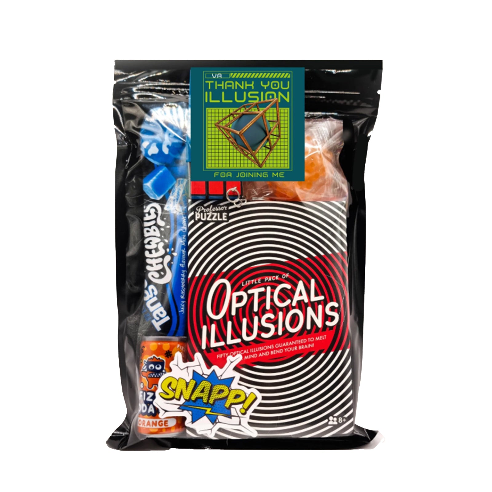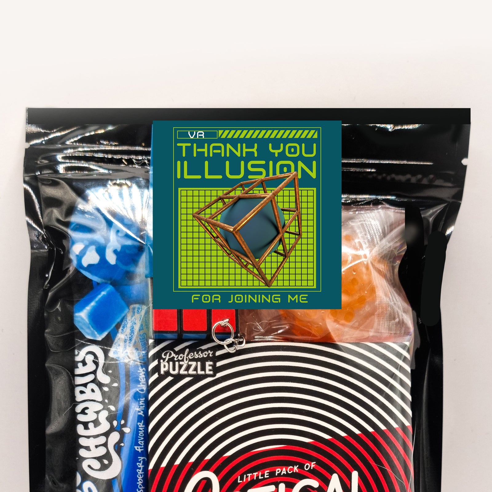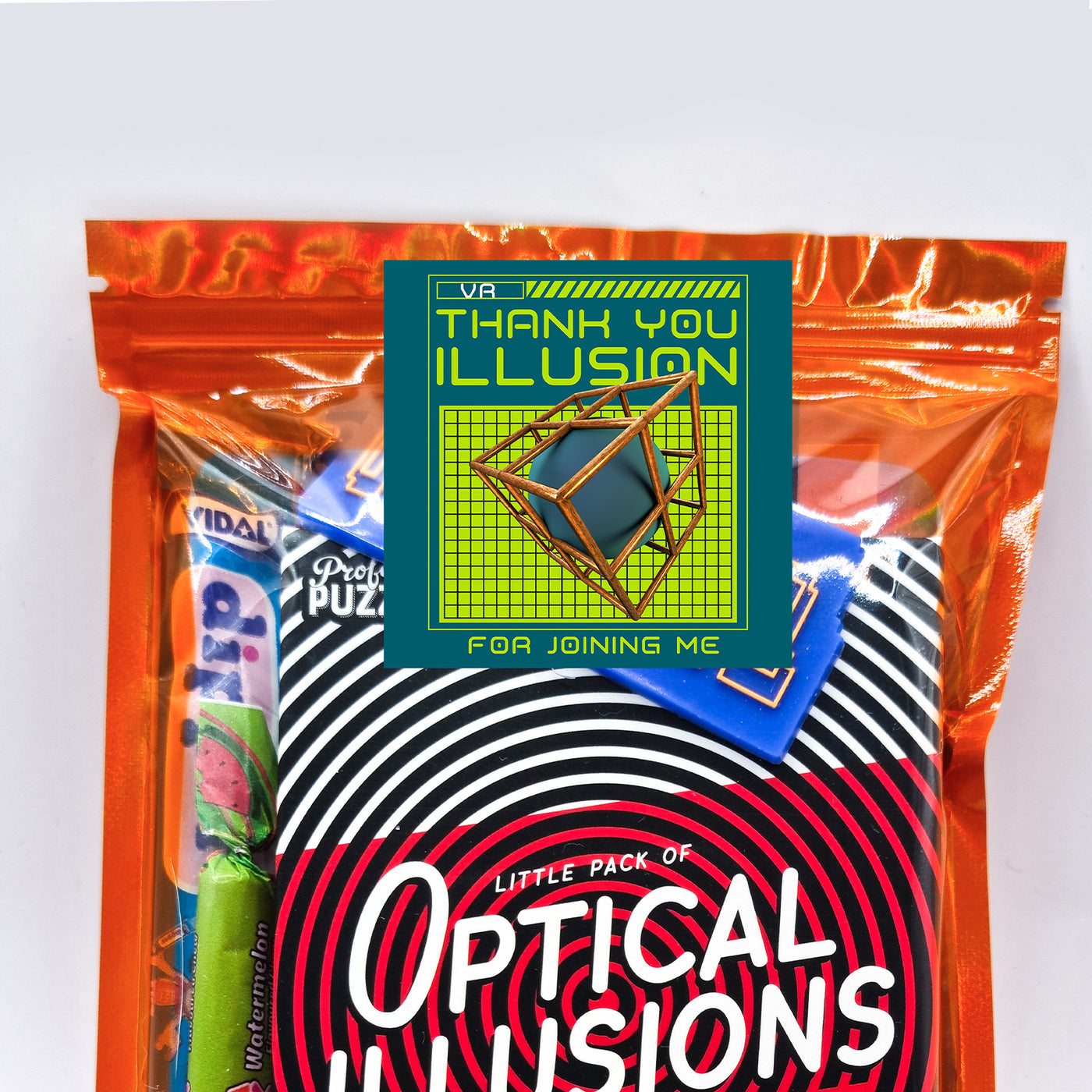 Pre-Filled Birthday Party Goody Bags for Older Boys and Girls – Perfect for Teens! These pre-packed gift bags are ideal for older kids and teens, designed to suit a variety of party themes, including Video Gamer, Illusion, and Magic. Each bag is thoughtfully prepared in a sleek, resealable black gift bag, adorned with a custom 3D Illusion VR sticker and a personalized appreciation message. Inside each party bag, you'll find novelty treats to entertain older children, such as a set of 50 illusion cards, a squishy fidget toy, comic laptop stickers, a cube puzzle keyring, and vegetarian sweets. Delivered quickly to your door, these goody bags make the perfect party treats, especially for tech, gaming, and magic-themed events.