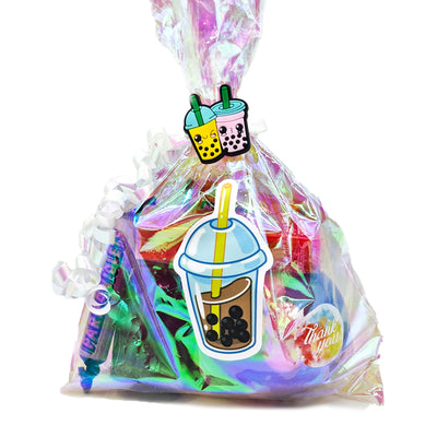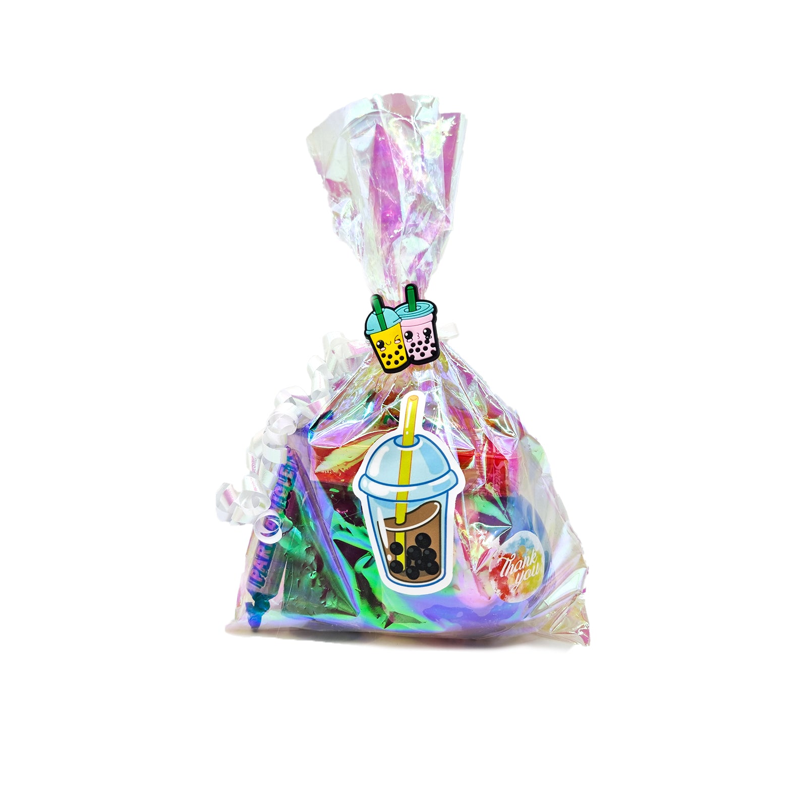 Elegant Presentation: Featuring shimmering iridescent cellophane gift bags tied with luxurious ribbon and finished with adorable boba-themed tags, these bags add a touch of sophistication to your event.