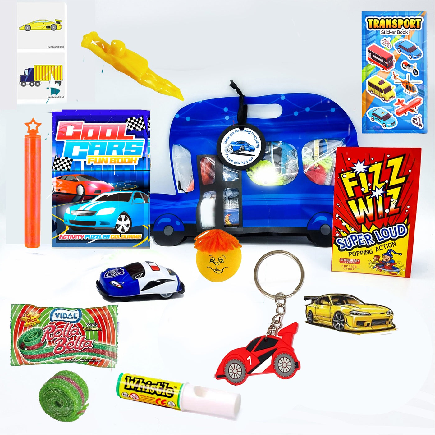 Looking for a hassle-free and enjoyable way to prepare for your child's upcoming birthday celebration? Look no further than our pre-filled blue car party goody bags! These bags are filled with high-quality mini items, making them the perfect addition to any vehicle-themed party. Not only do they serve as delightful treats, but they also make a fantastic party decor. Each bag contains exciting treats and vegetarian sweets.