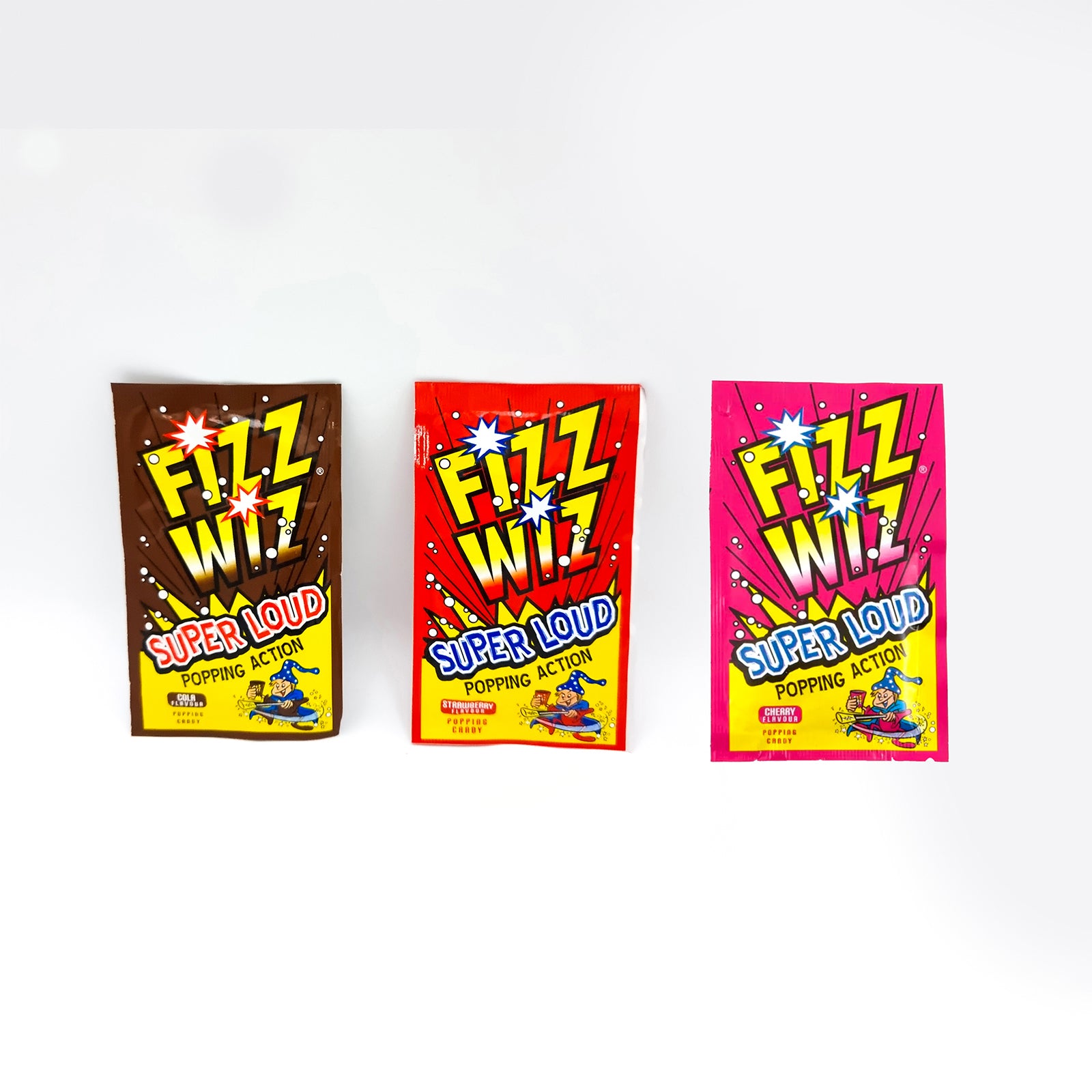 1x Fizz wizz popping cola, cherry, or strawberry candy: Loud powdered popping candy in 3 randomly selected flavours. ALLERGENS: Contains MILK