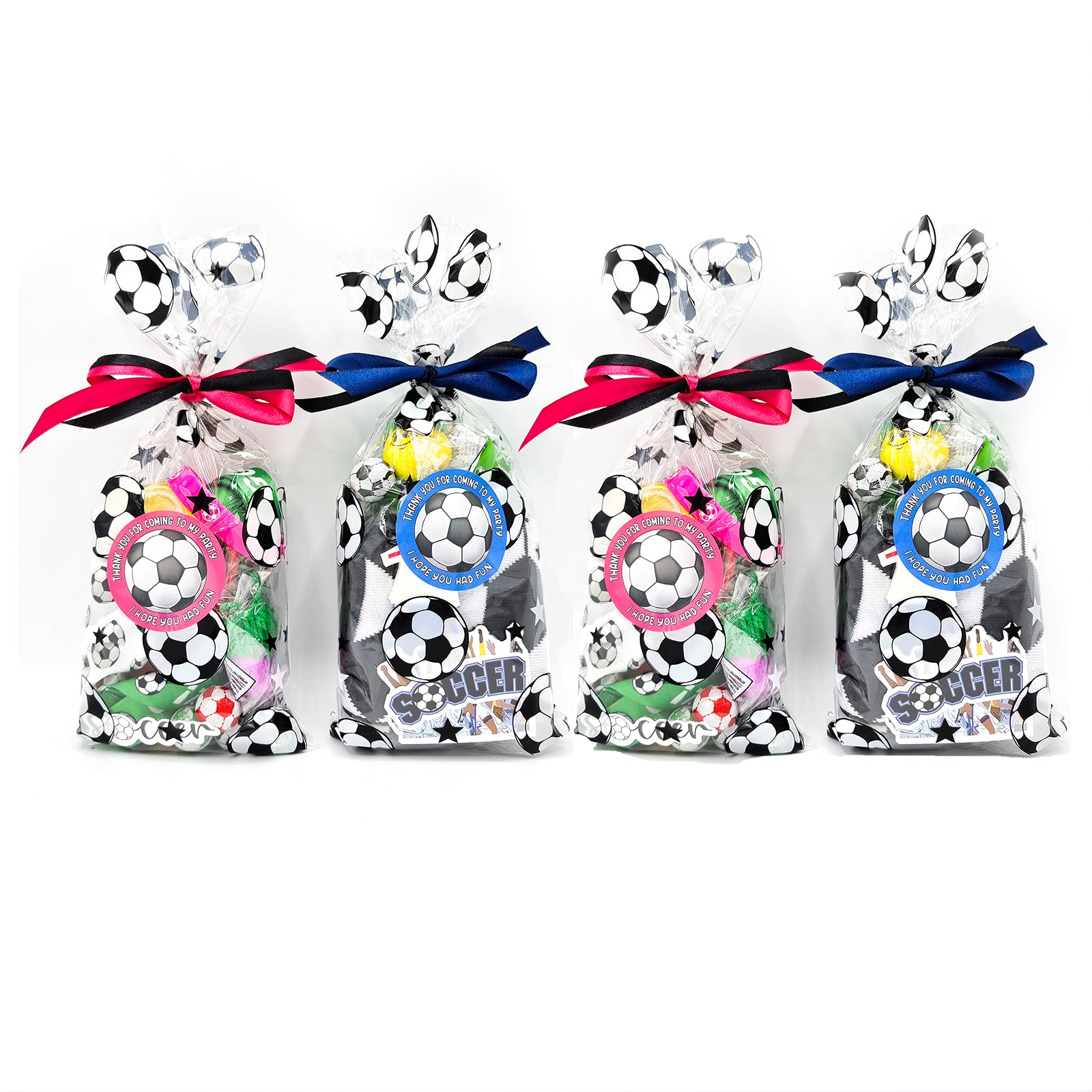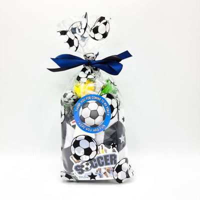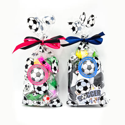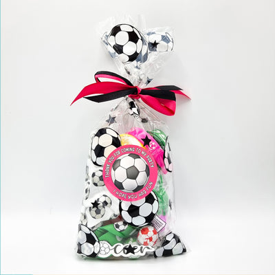 Our party bags come pre-packed in football-printed cellophane bags, available in blue or pink designs with unique contents tailored for boys and girls. They are finished with a double satin ribbon and each bag includes a sticker with a message that says, "Thank you for coming to my party".