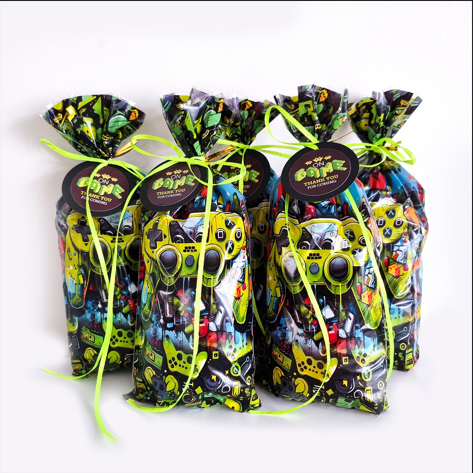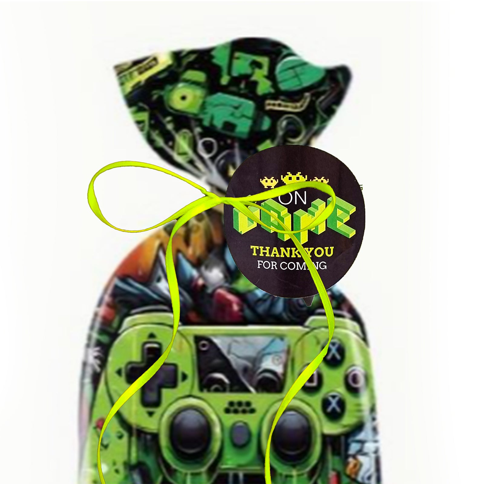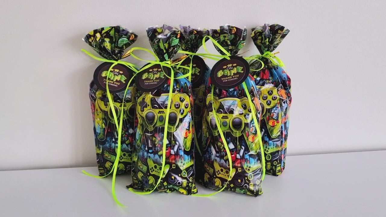 Pre filled 'Graffiti gamer' birthday party favours are pre packed for you and delivered fast to your door. Suitable for gaming loving children, boys and girls. Pere packed in colourful graffiti gaming console design gift bags and adorn with a neon green ribbon and a gamer swing tag with a thank you message, showing a gratitude to your guests..