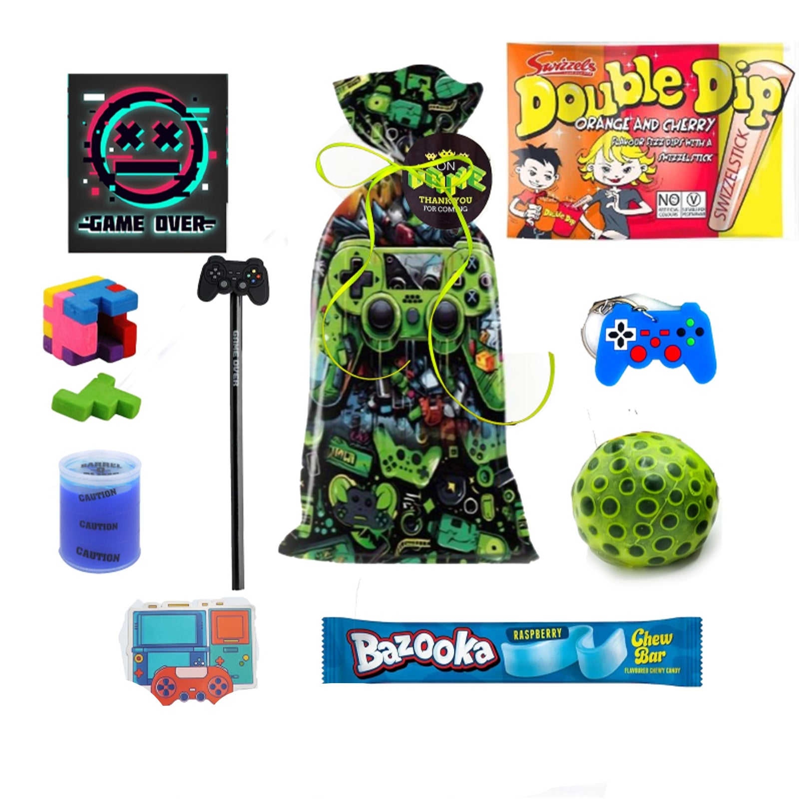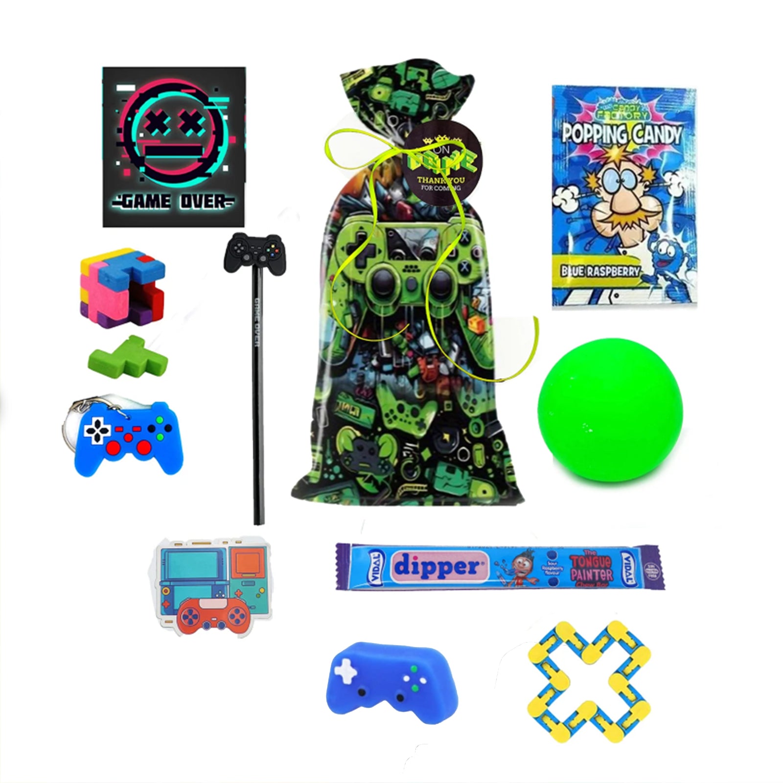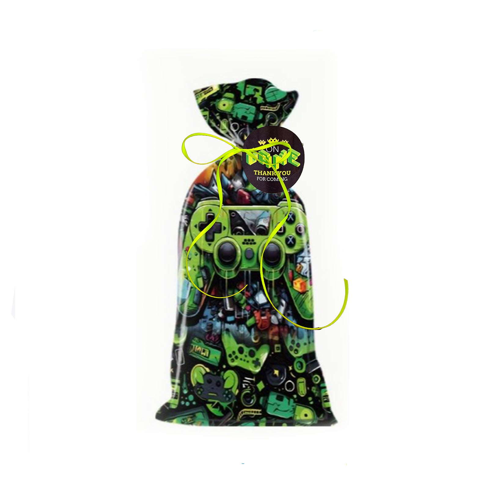 Pre filled 'Graffiti gamer' birthday party favours are pre packed for you and delivered fast to your door. Suitable for gaming loving children, boys and girls. Pere packed in colourful graffiti gaming console design gift bags and adorn with a neon green ribbon and a gamer swing tag with a thank you message, showing a gratitude to your guests..