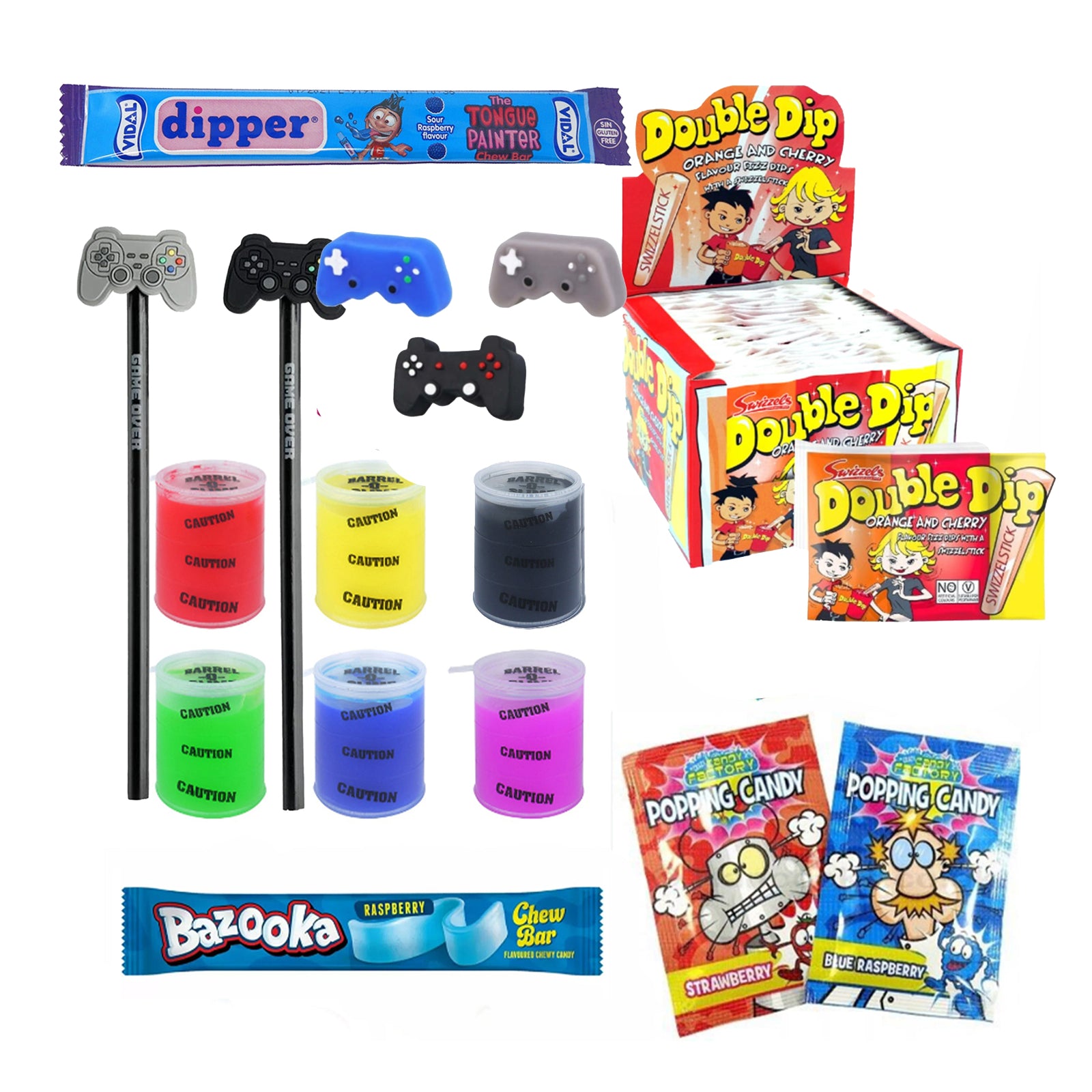 - 1x Pooping Candy: Crazy Candy Factory sachet of loud popping candy in fruit flavours. ALLERGENS: Contains MILK.