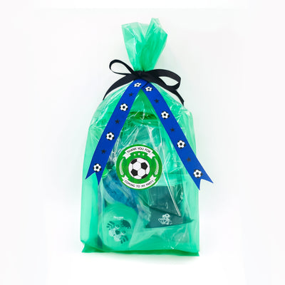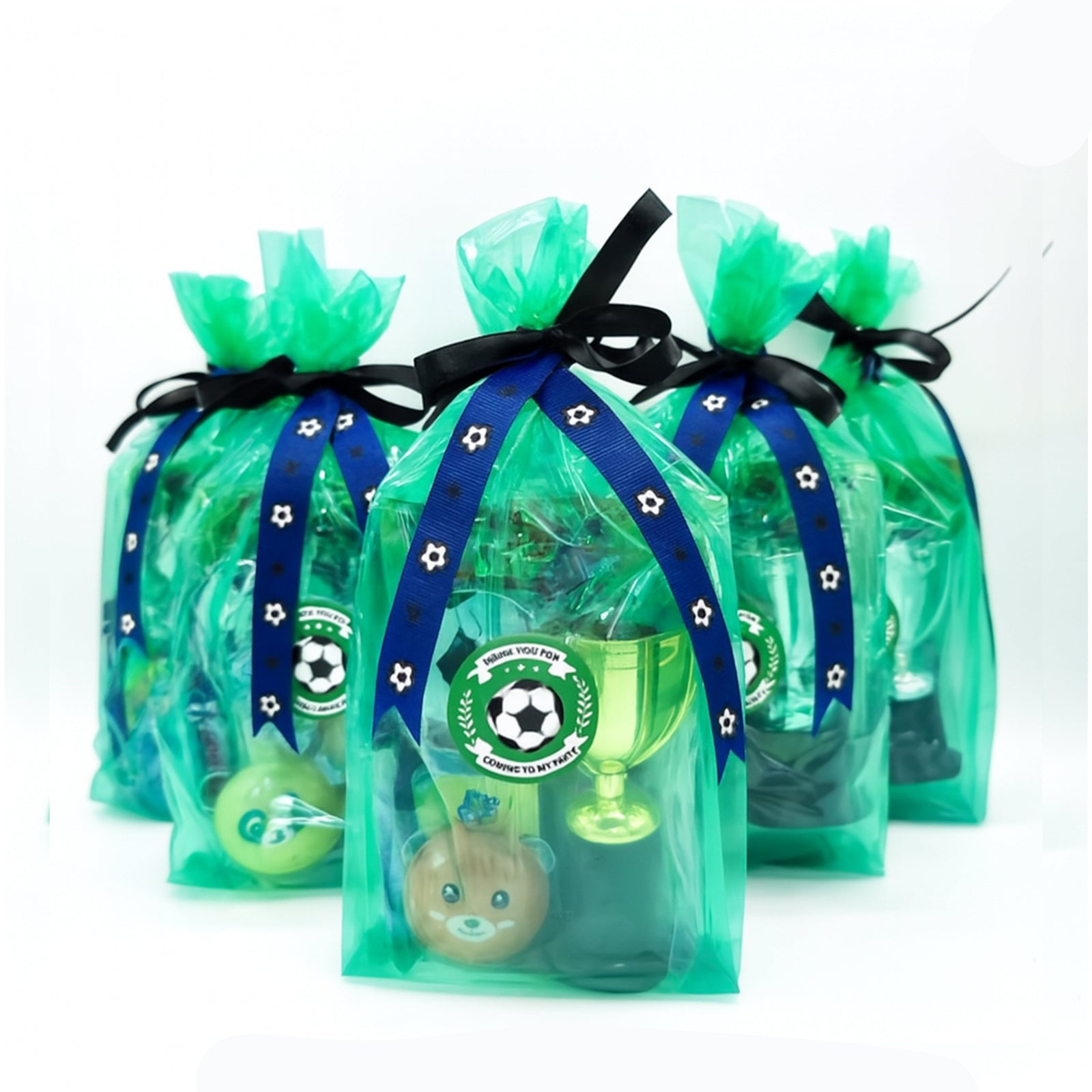 Not only do these party bags offer unbeatable value, they also come in stylish double-layered green cellphone bags, tied up with a black and blue football printed ribbon. And to make your young guests feel extra special, each bag features a green football sticker with a message thanking them for coming to the party.