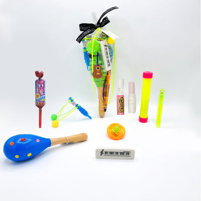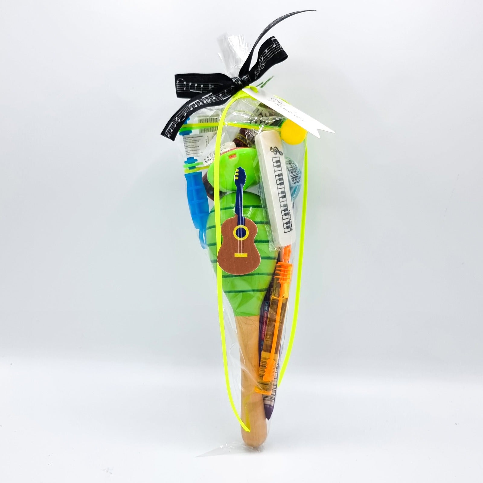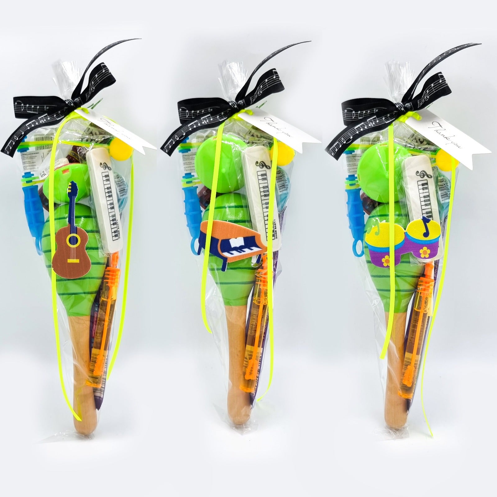 Experience the ultimate party joy with our premium pre-packed party bags! Delivered to your door, these clear cellophane party gift cones are filled with a vibrant array of musical treasures – handmade maracas, growling tubes, clickers, and vegan candy. The visual delight continues with charming musical notes and neon ribbons. Each bag includes assorted musical instrument stickers and a thank-you tag, ensuring your guests feel appreciated. Perfect for any music-themed or disco party, these bags guarantee an unforgettable event filled with colour, music, and excitement!