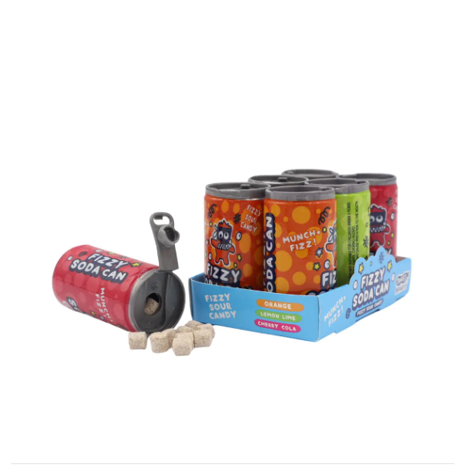 - 1x Rainbow Lollipop: Fruit flavoured. Assorted shapes. - 1x Mini Fizzy Candy Can