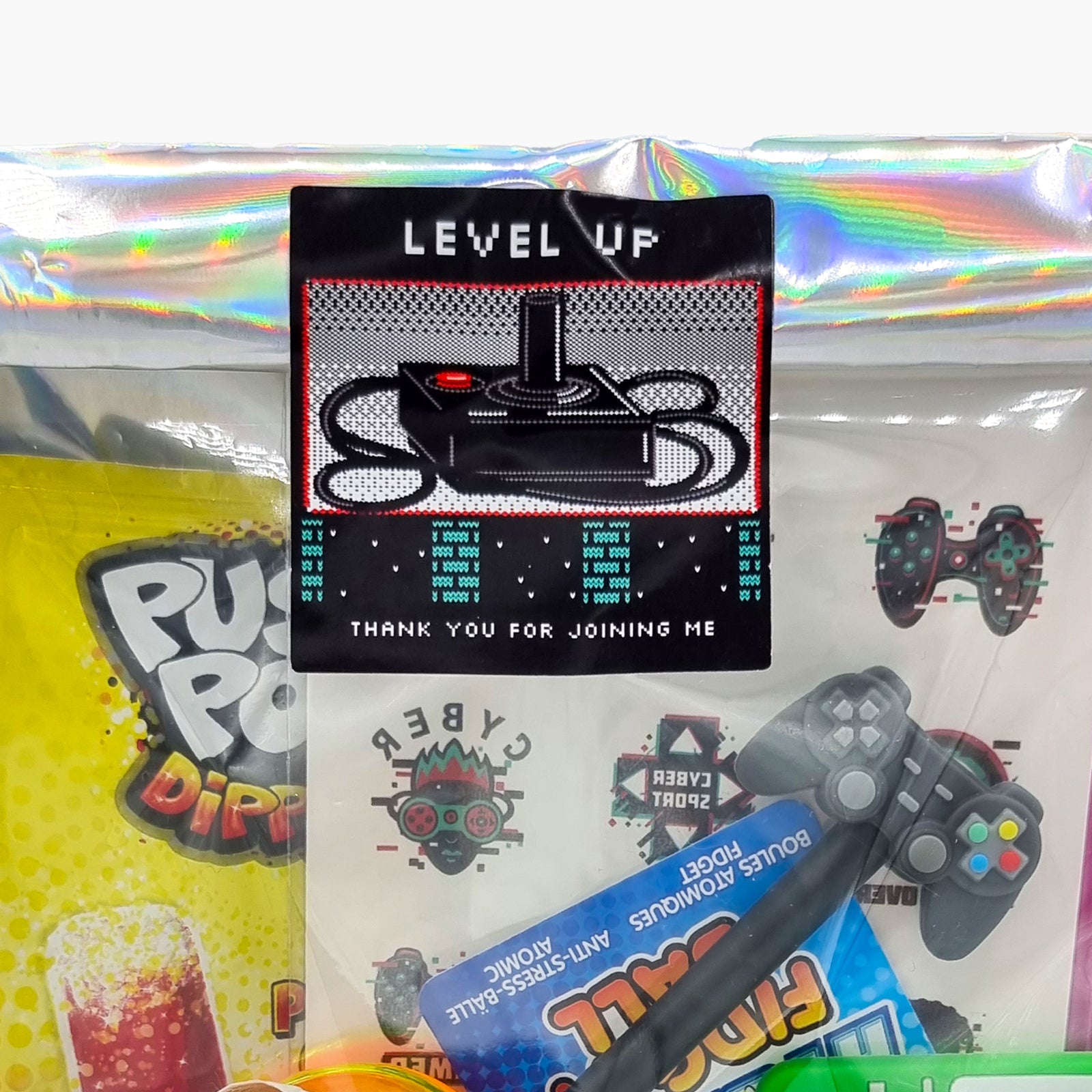A stylish large metallic gift bag sealed with a retro gamer thank-you sticker, adding a premium finishing touch.