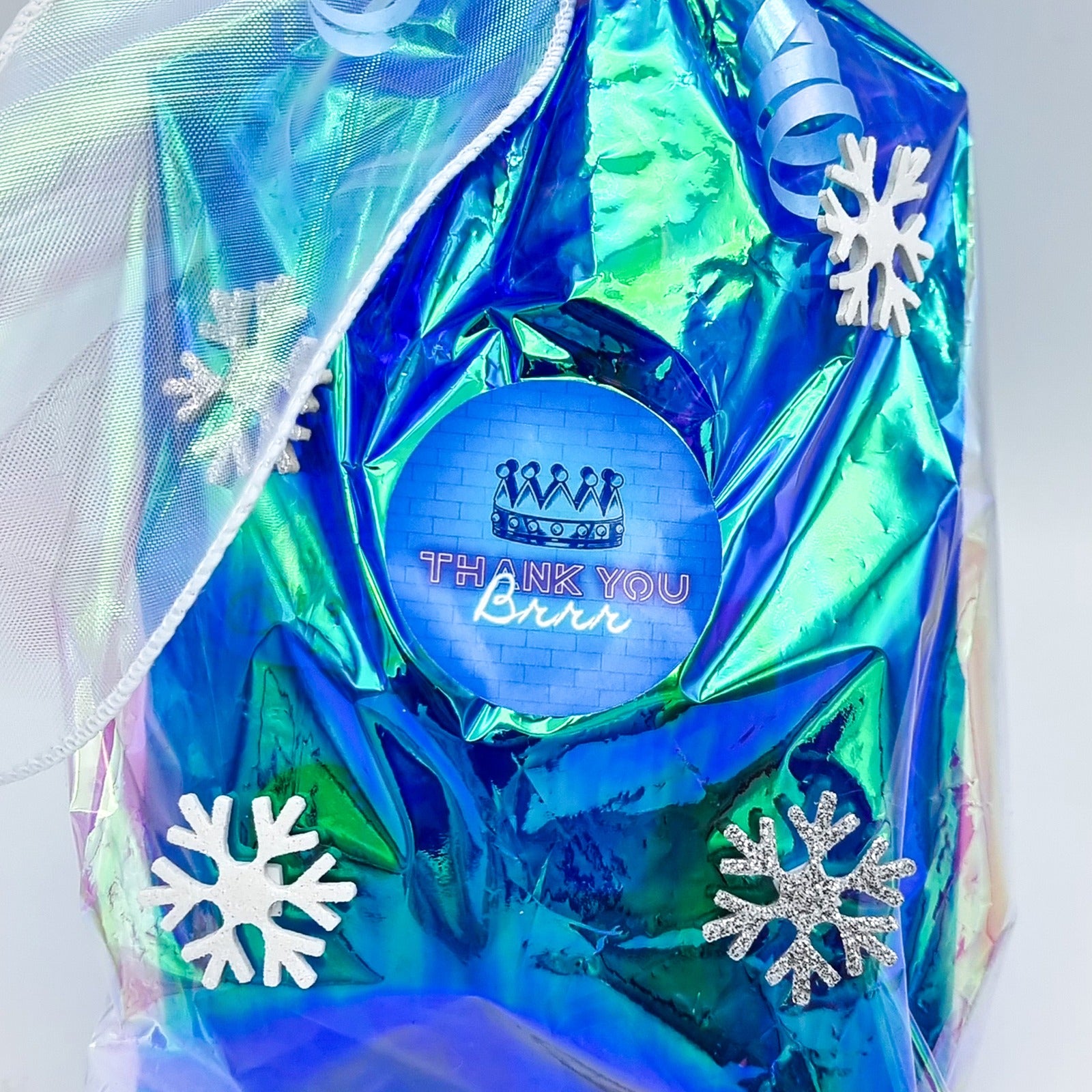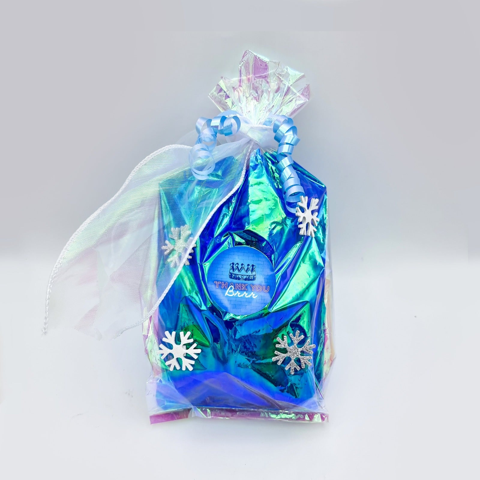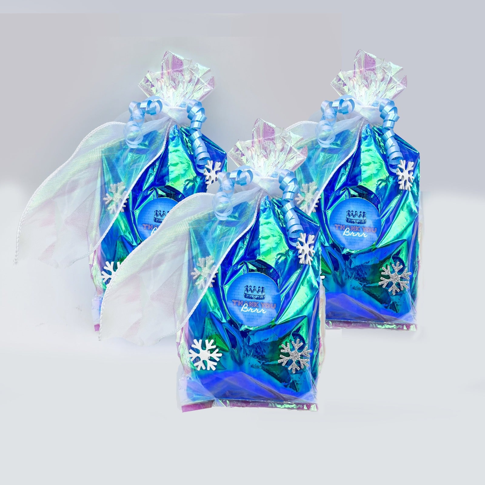 These beautiful goody bags feature a mesmerizing blue iridescent finish, decorated with sparkly snowflakes and a princess crown sticker with a heartfelt “Thank You” greeting. Elegantly tied with sparkly ribbons, they create a stunning presentation.