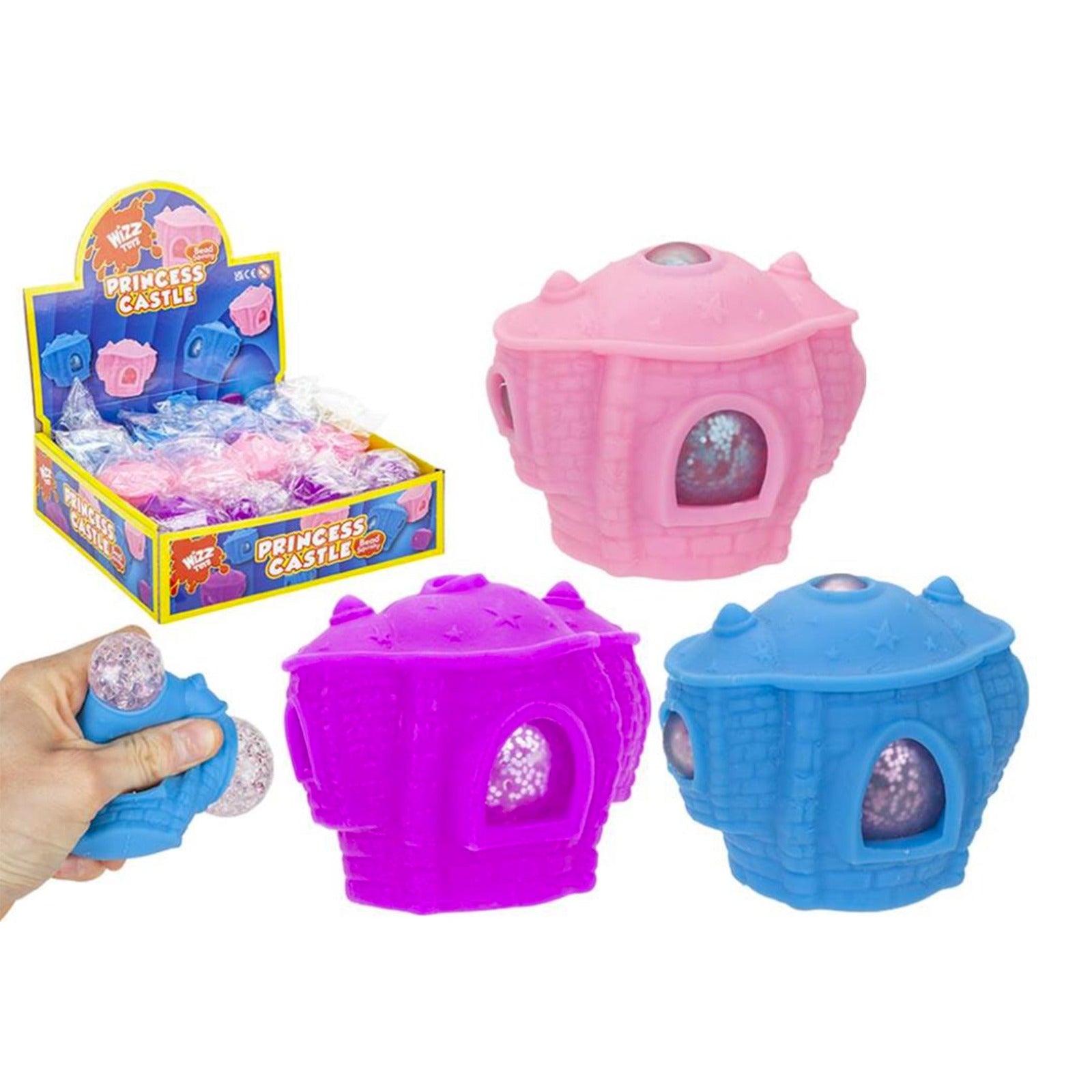 1x Princess Castle Glitter Squishy toys in assorted colours. Great sensory fidget toy. Assorted mixed colours: pink, blue, purple.